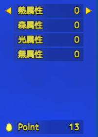 割り振った属性ポイントは、ステージ選択画面でメニューのステータス画面を開き、「Point」を選択することでリセットすることができます。