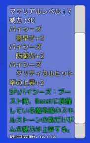 マテリアルストーンを装備すると、マテリアルストーンに表記されたプラス能力が足されます。プラス能力には「セイズ能力」、「Boost能力」、「SP能力」の3種類があります。
